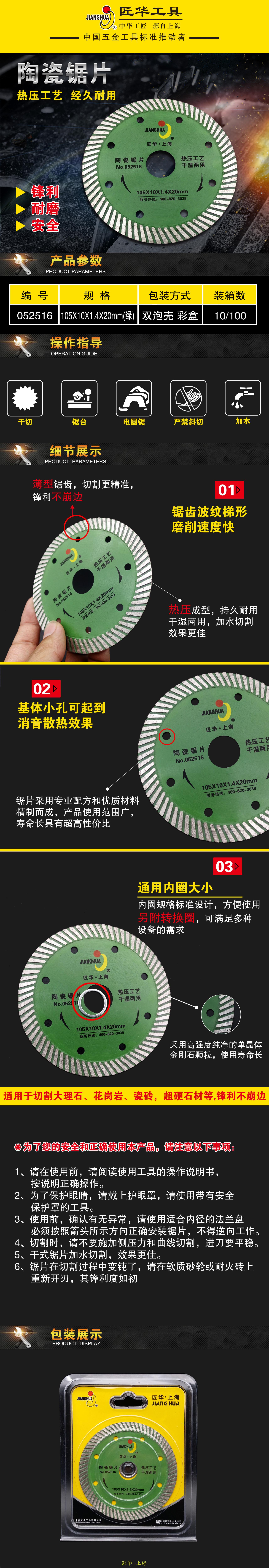 热压工艺,经久耐用。适用于切割大理石、花岗岩、瓷砖、超硬石材等,锋利不崩边。